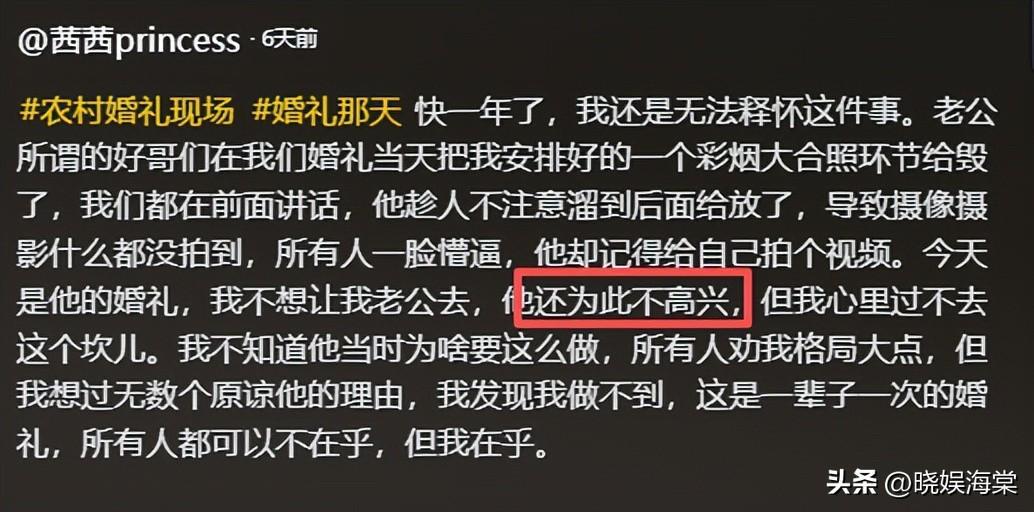 仪式结束后,茜茜再也忍不住,拉着新郎的手委屈地哭诉:“我的宣誓环节全毁了,连一张照片都没有,那是我最看重的部分啊!”